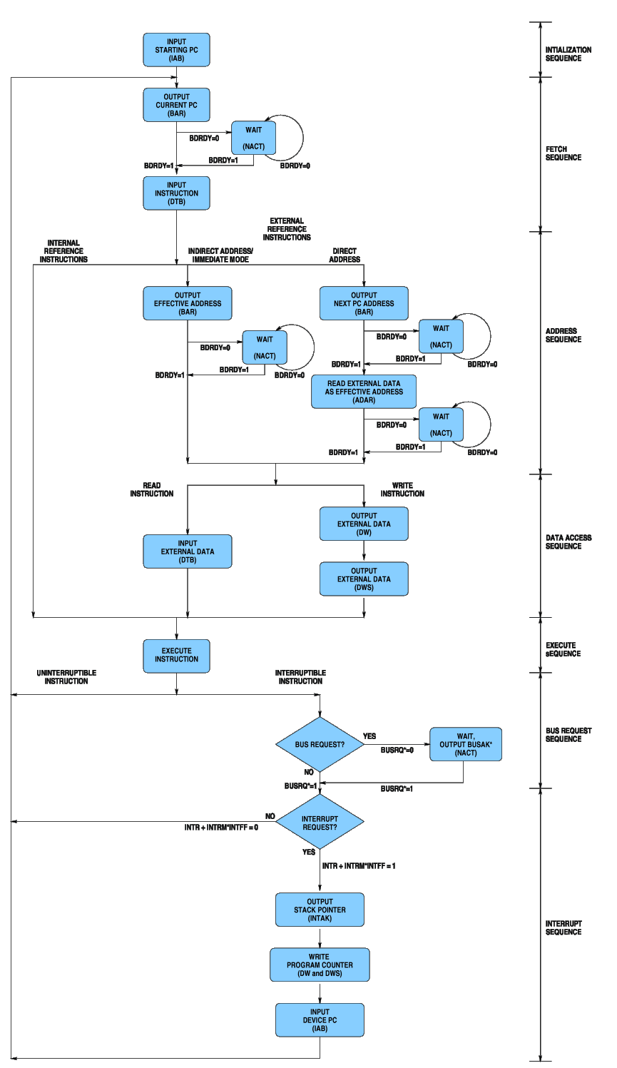 Not shown are the states for the various NACT spacing cycles that the CP-1600 introduces, other than those introduced for wait states due to BDRDY. Also not shown are the state transitions for reading Double-Byte Data using SDBD.